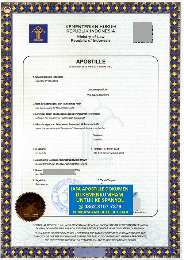 Untuk Informasi Biaya Jasa Apostille di Kemenkumham untuk digunakan di Spanyol Silakan Hubungi Kami: